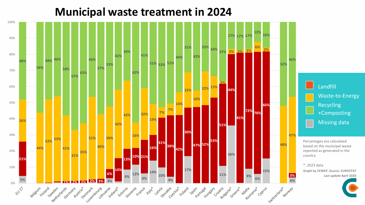 Calculations made by CEWEP (The Confederation of European Waste-to-Energy Plants) indicate that Europe will still produce around 142 million tonnes of non-recyclable waste in 2035 even if all the waste targets set by EU Waste Laws adopted in 2018 are reached on time.
