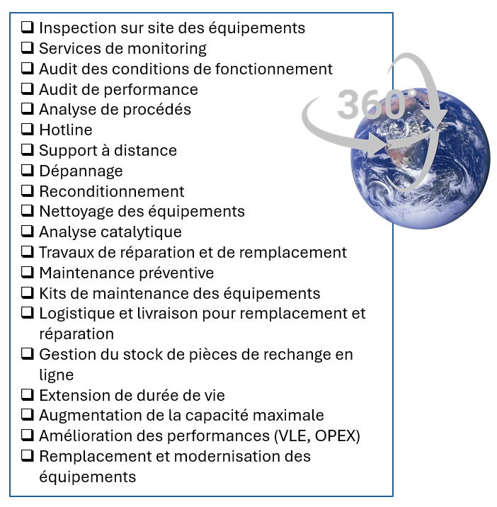 Inspection sur site des équipements Services de monitoring Audit des conditions de fonctionnement Audit de performance Analyse de procédés Hotline Support à distance Dépannage Reconditionnement Nettoyage des équipements Analyse catalytique Travaux de réparation et de remplacement Maintenance préventive Kits de maintenance des équipements Logistique et livraison pour remplacement et réparation Gestion du stock de pièces de rechange en ligne Extension de durée de vie Augmentation de la capacité maximale Amélioration des performances (VLE, OPEX) Remplacement et modernisation des équipements.